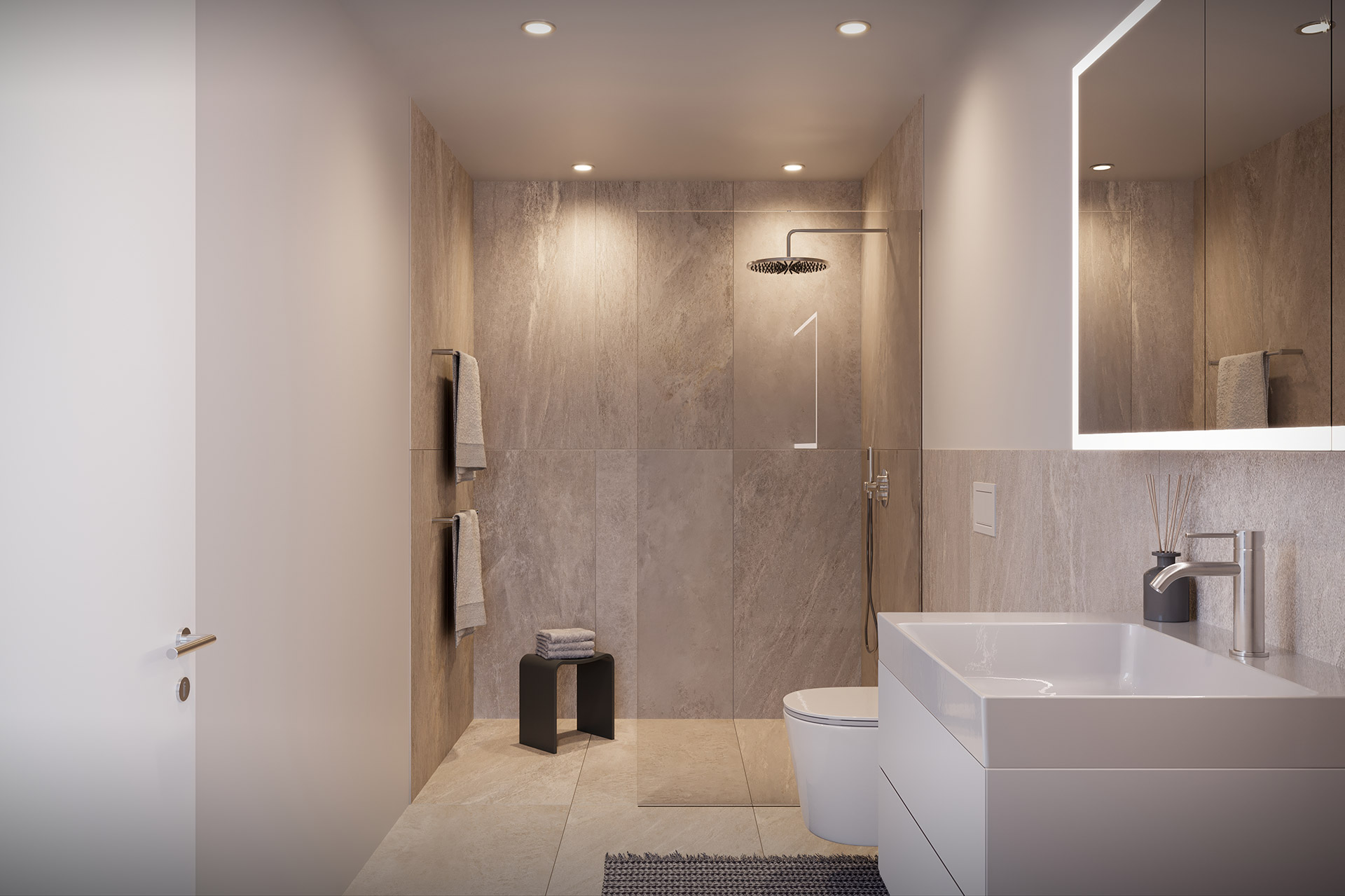 Das Architektenteam hat bei den Grundrissen einen Ansatz verfolgt, der all jene anspricht, die eine Verbindung zwischen klassischem Wohnungszuschnitt und offenem Loftkonzept suchen: Die Grundrisse vereinen auf gelungene Weise Grosszügigkeit mit Raum für Rückzug. Jede Wohnung verfügt über zwei Badezimmer, eines mit Badewanne und eines mit bodenebener Dusche. Diese erfüllen sowohl räumlich als auch in Bezug auf die Materialien höchste Ansprüche.