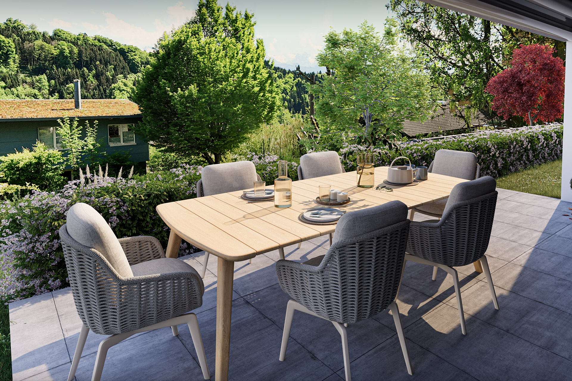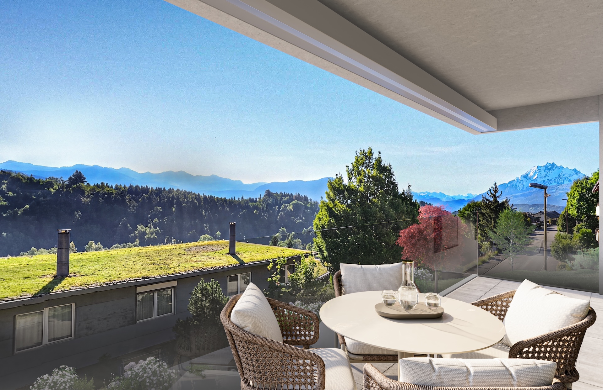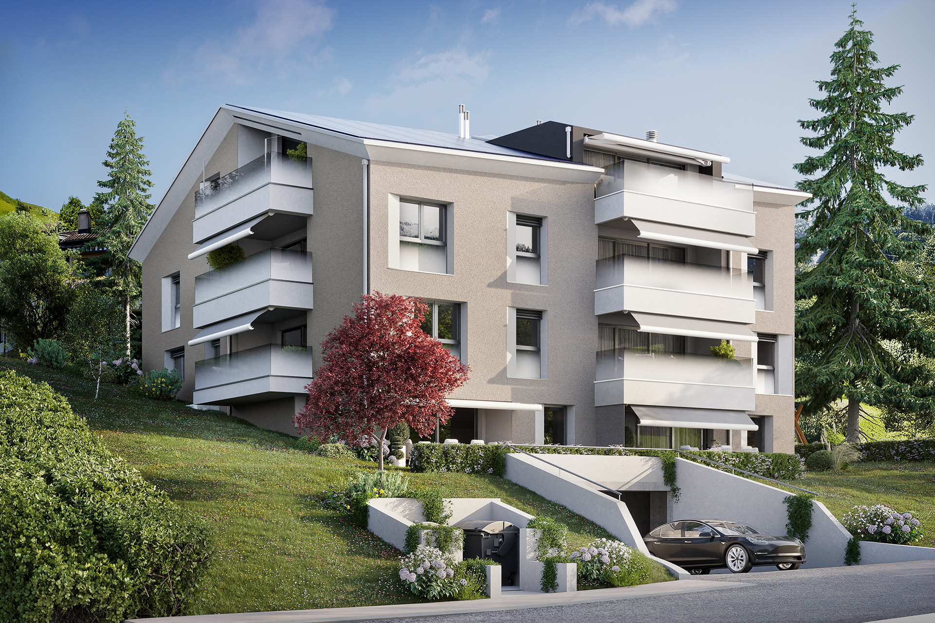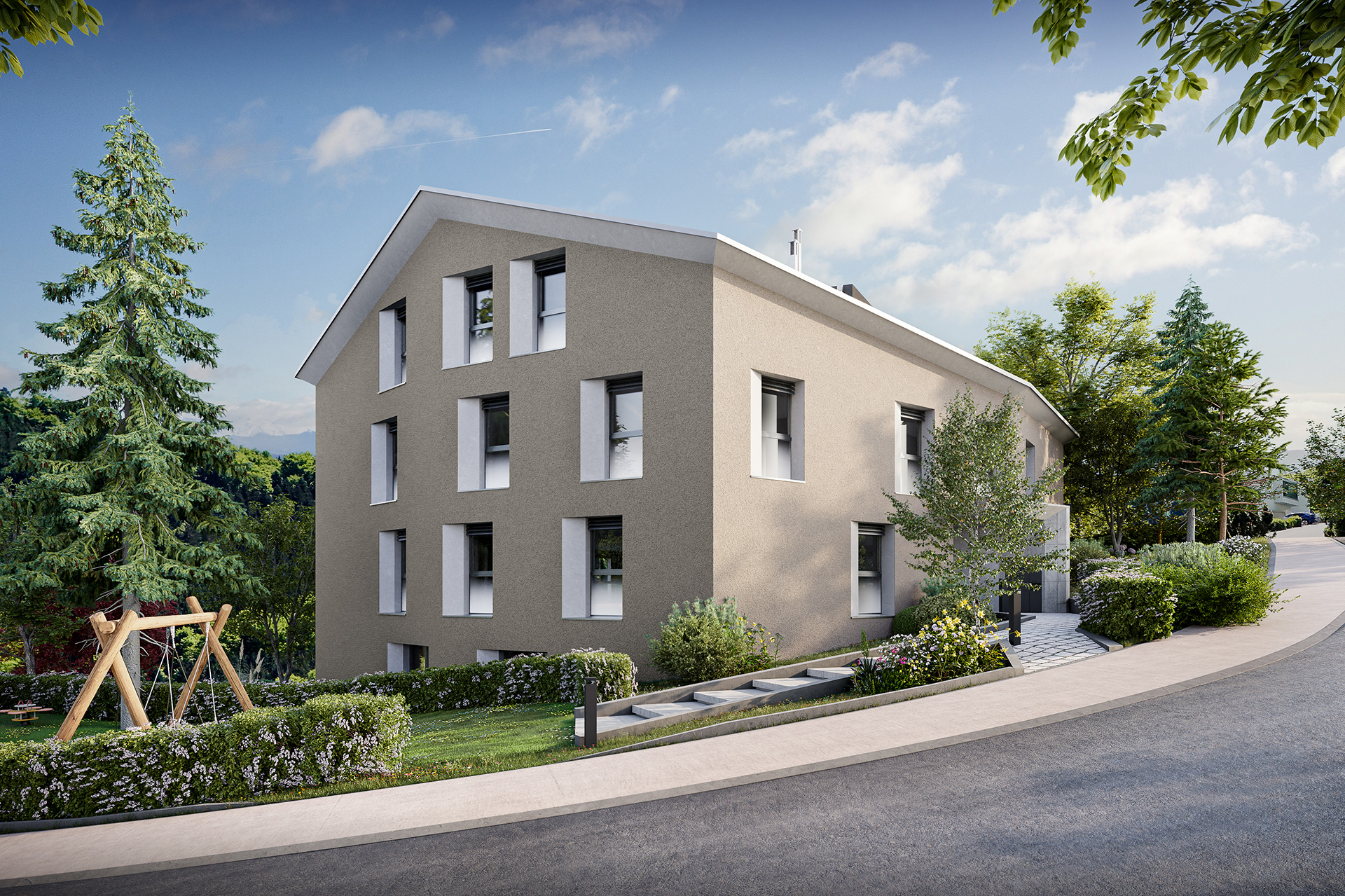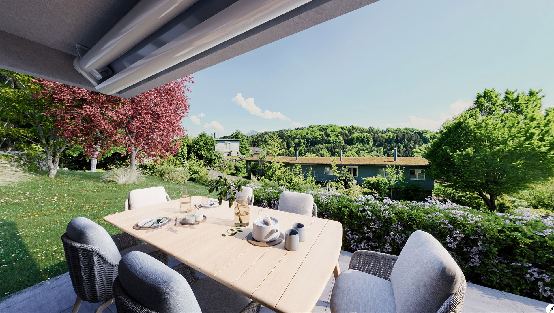 Die cleveren Grundrisse perfektionieren die Licht- und Sonnenverhältnisse in den Innen- und den Aussenräumen, das Raumprogramm bringt Zusammensein und Rückzug in eine harmonische Balance. Das Erdgeschoss umfasst jeweils einen grossen Wohn-Ess-Bereich mit einer offenen Küche sowie direktem Zugang zum gedeckten, absolut sonnenverwöhnten Aussensitzplatz.